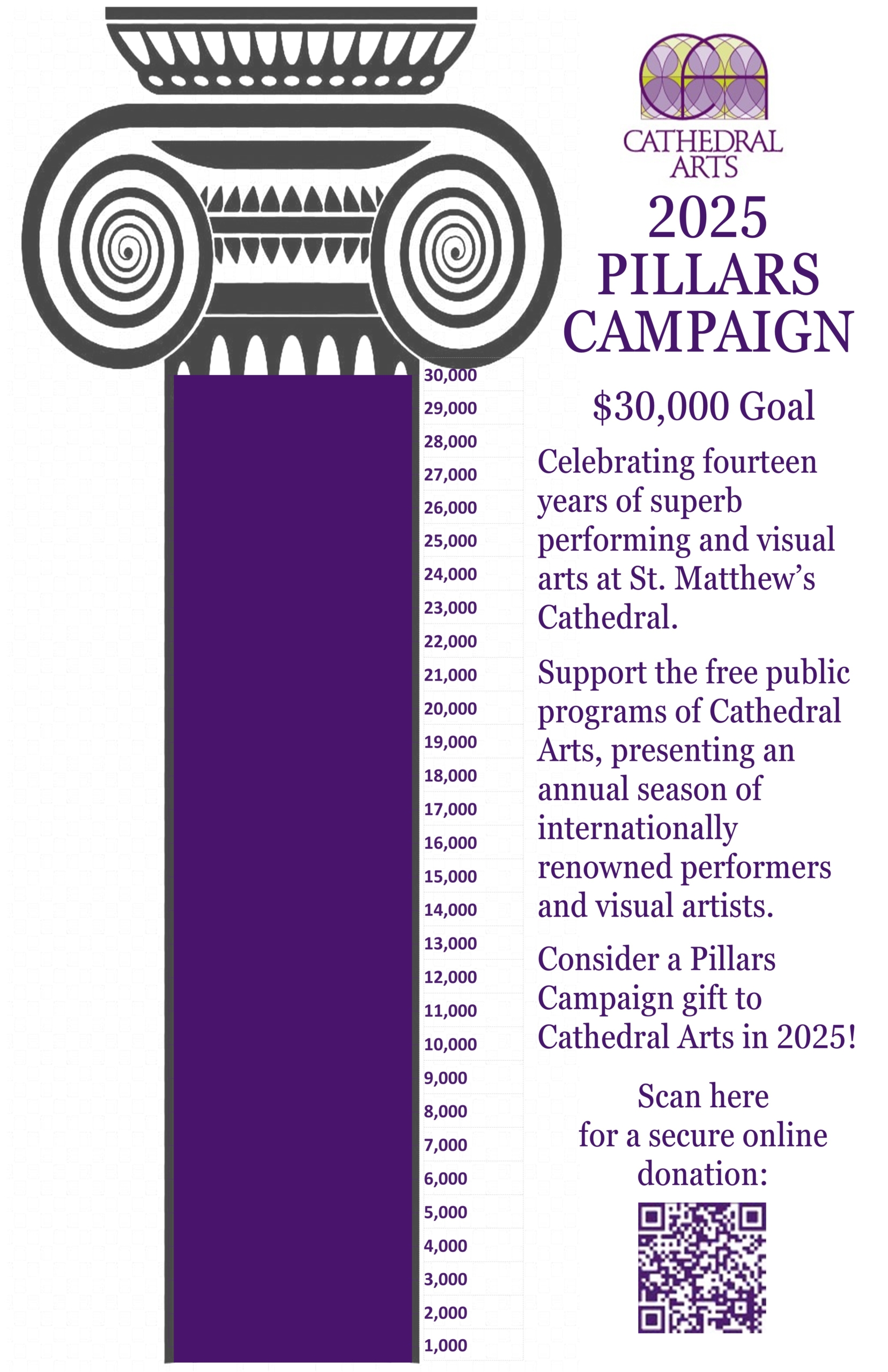 Cathedral Arts depends upon your support as we continue to grow and plan for the future. The goal for the 2025 Pillars Campaign is $30,000 – only 300 gifts of $100 each. Your gift of one or more Pillars at $100 each enables Cathedral Arts to offer a season of outstanding free public arts programming at St. Matthew’s Episcopal Cathedral.